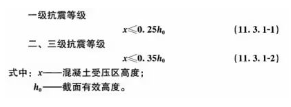 1、抗震设计时,计入受压钢筋作用的梁端截面混凝土受压区高度与有效高度之比值,一级不应大于0.25,二、三级不应大于0.35。